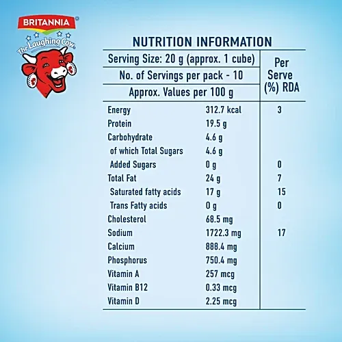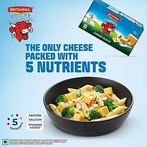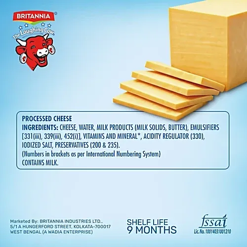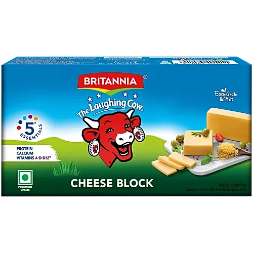 Britannia The Laughing Cow Cheese Block is a creamy and delicious cheese made from cow's milk. It comes in a block that you can cut, melt, and grate to create mouthwatering dishes. Enjoy its authentic flavor and rich yellow color.